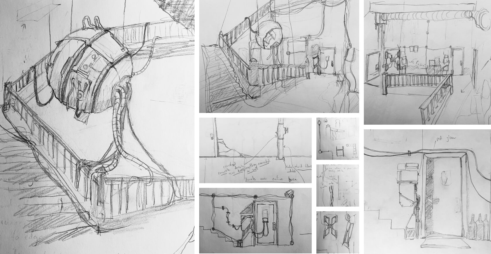 These are a few of the sketches I did when planning this project. I always do some sketches/doodles to get my ideas down on paper. Any amount of pre vis work goes a long way.